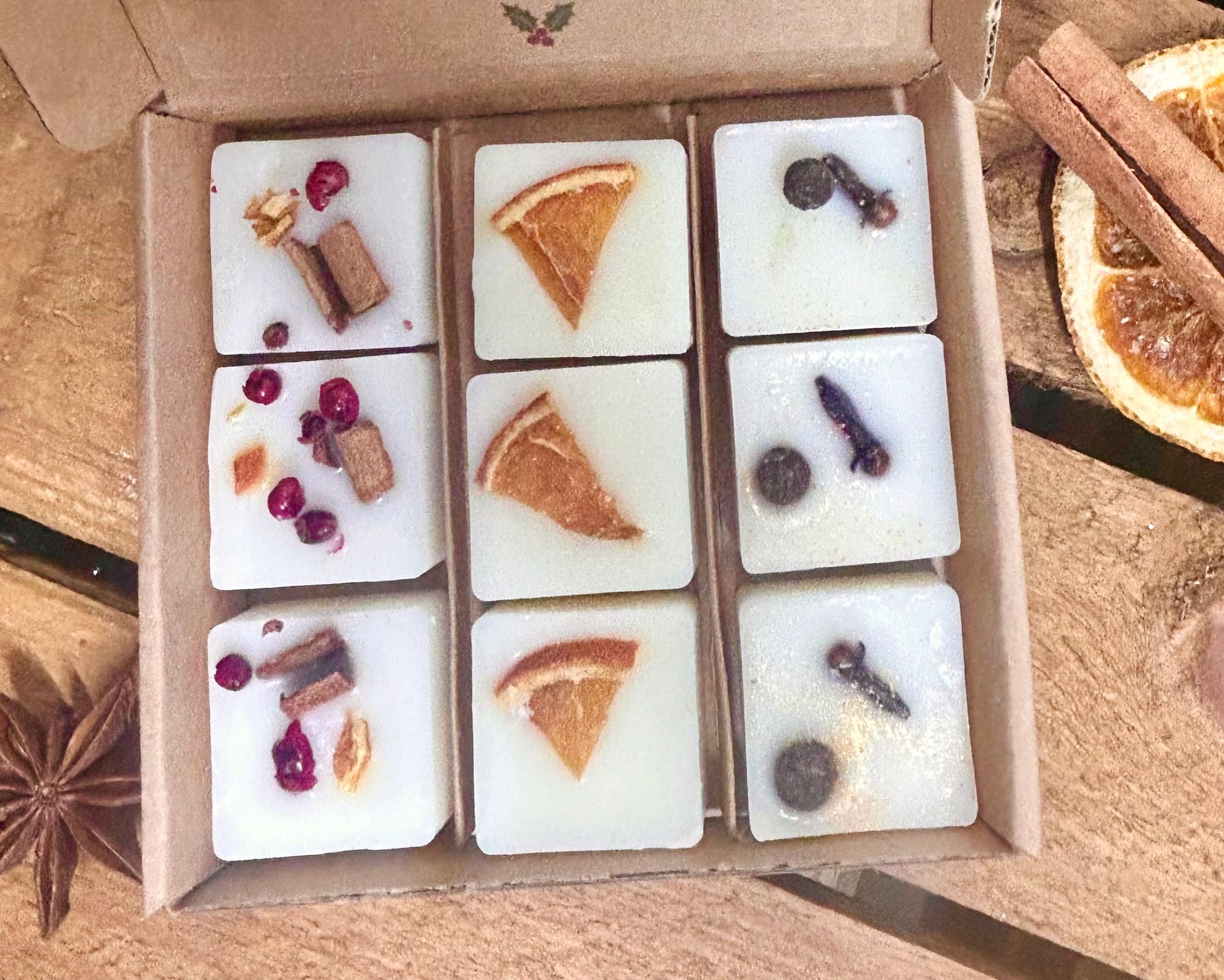 Inside each kraft gift box, you’ll find nine beautifully handcrafted soy wax melts, each measuring approximately 3 cm x 3 cm x 1 cm.